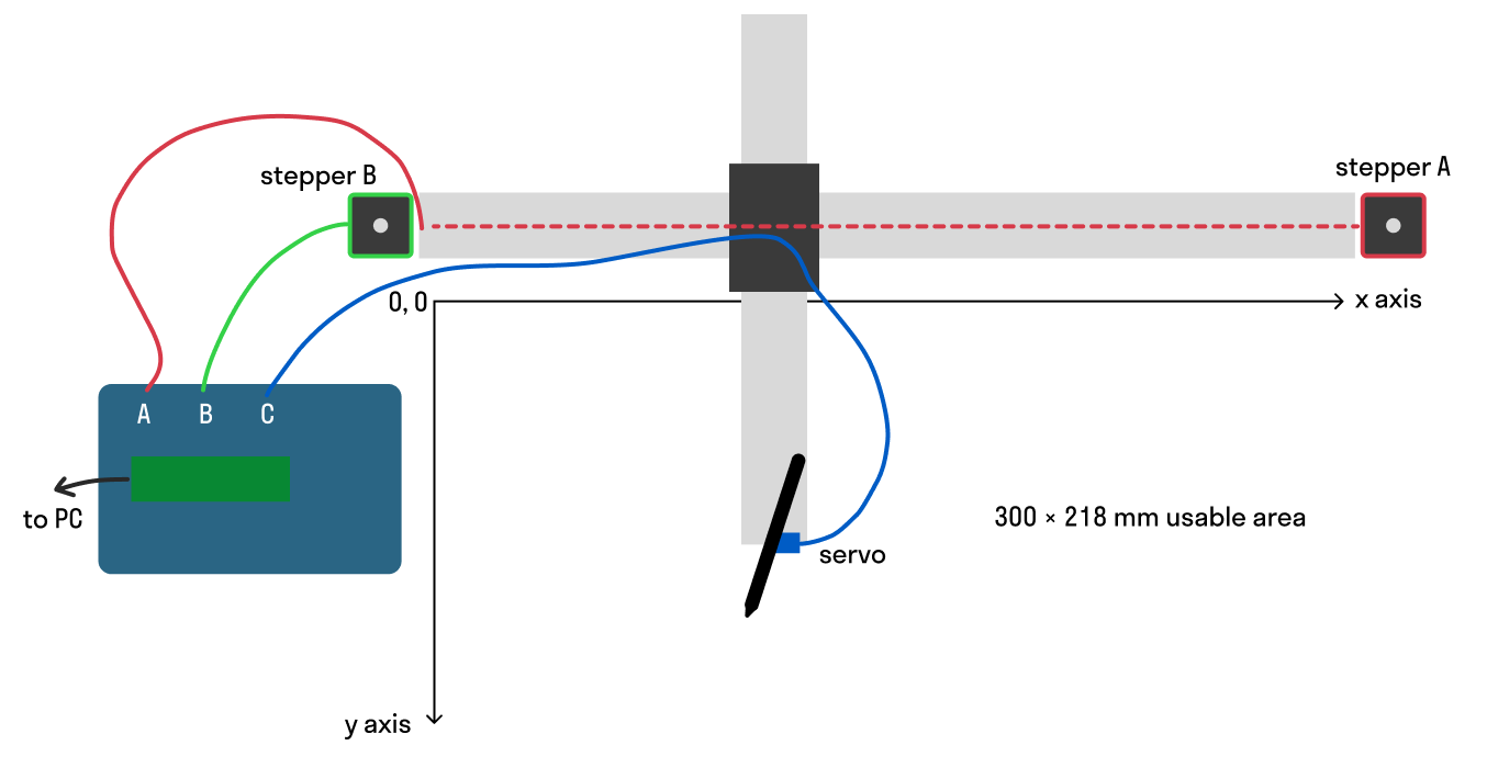 The kinematics equations of a machine describe how the motion of the machine's motors (here motors A, B and C) maps to the motion of its end-effector in the cartesian (XYZ) frame of reference. By convention, we define the X axis as the long axis of the Axidraw, pointing towards the right, and the X axis as the short axis of the Axidraw, pointing down (see axes on wiring diagram above).