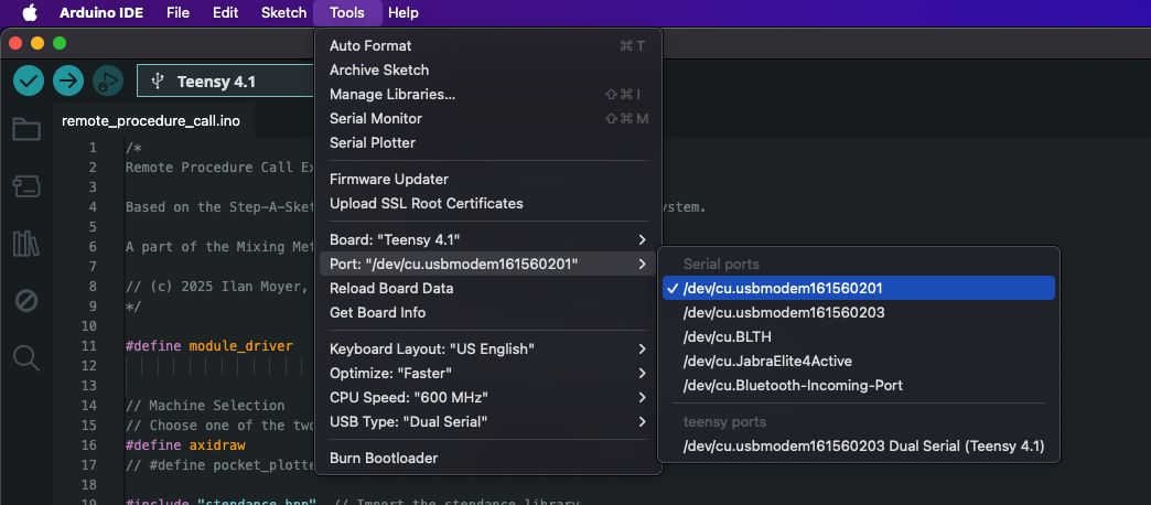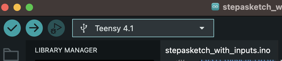 Plug the Stepdance module into your computer via a USB cable connected to the Teensy. Select the Teensy 4.1 (or 4.0) board and correct port from the Arduino IDE toolbar dropdown.
